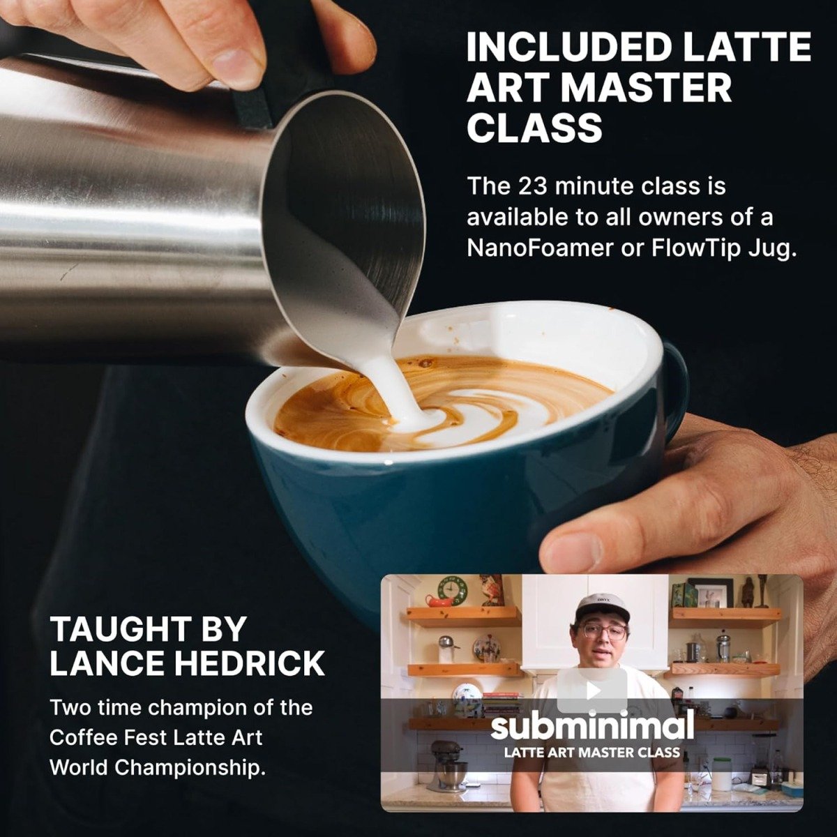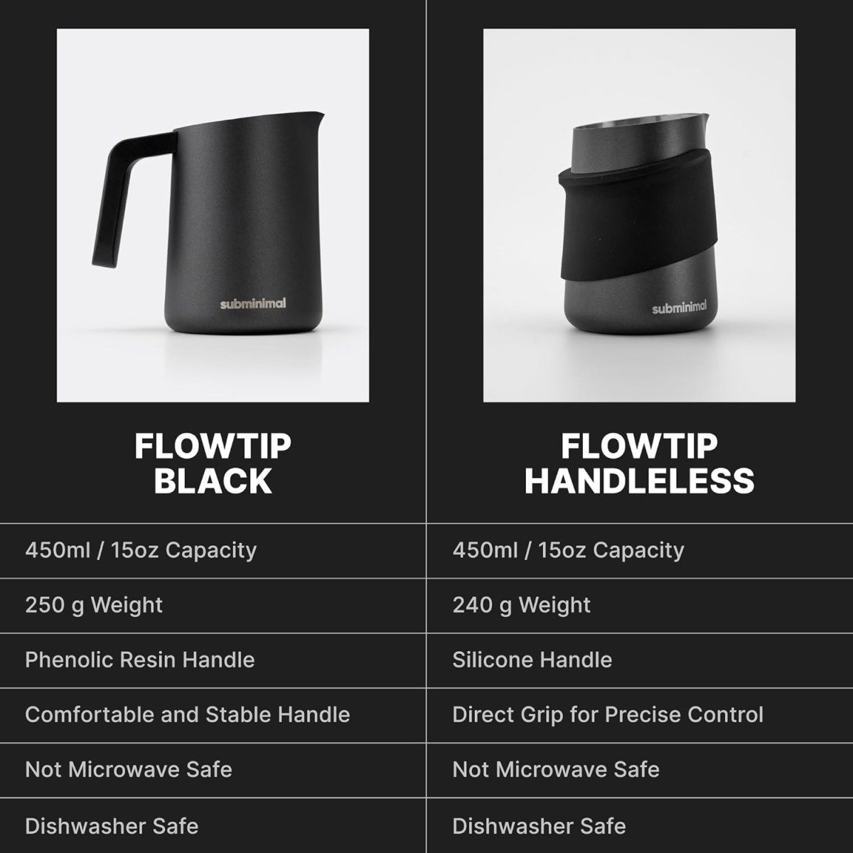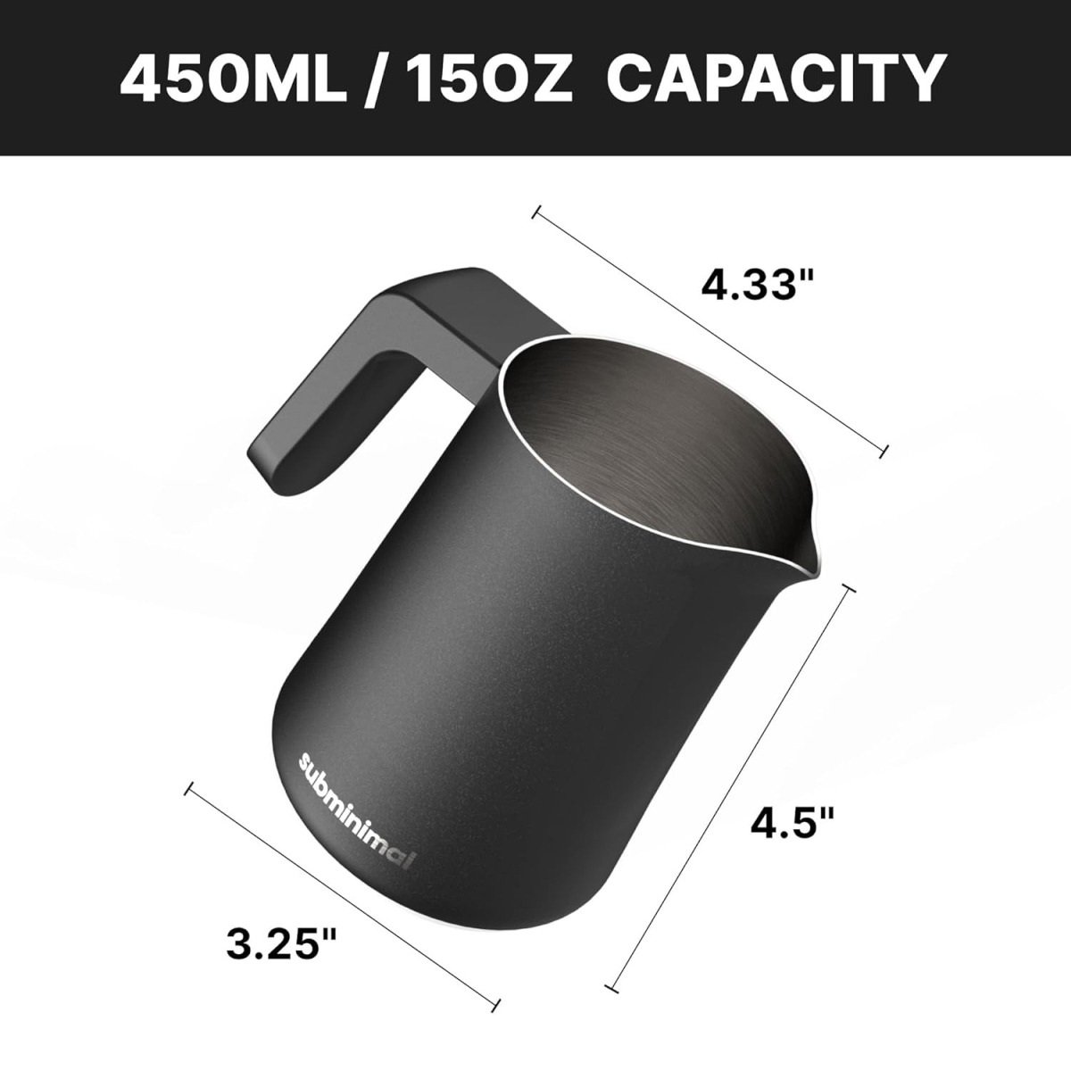 Subminimal FlowTip Milk Jug (450ml/15oz) – Advanced Design Milk Jug w/ Ergonomic & Heat Resistant Handle, StoveTop Compatible, Stainless Steel, Smooth Neck & Sharp Tip – Blackc