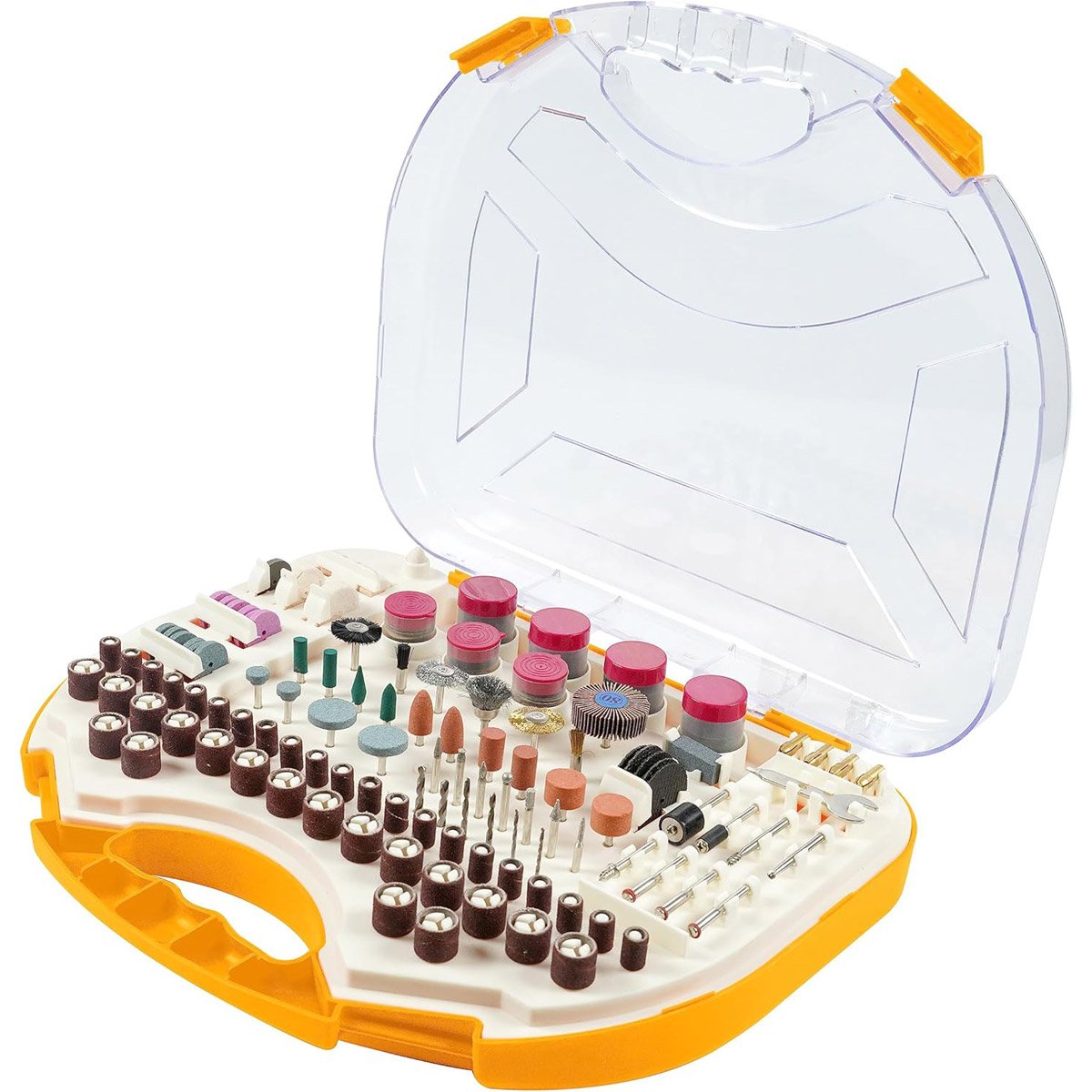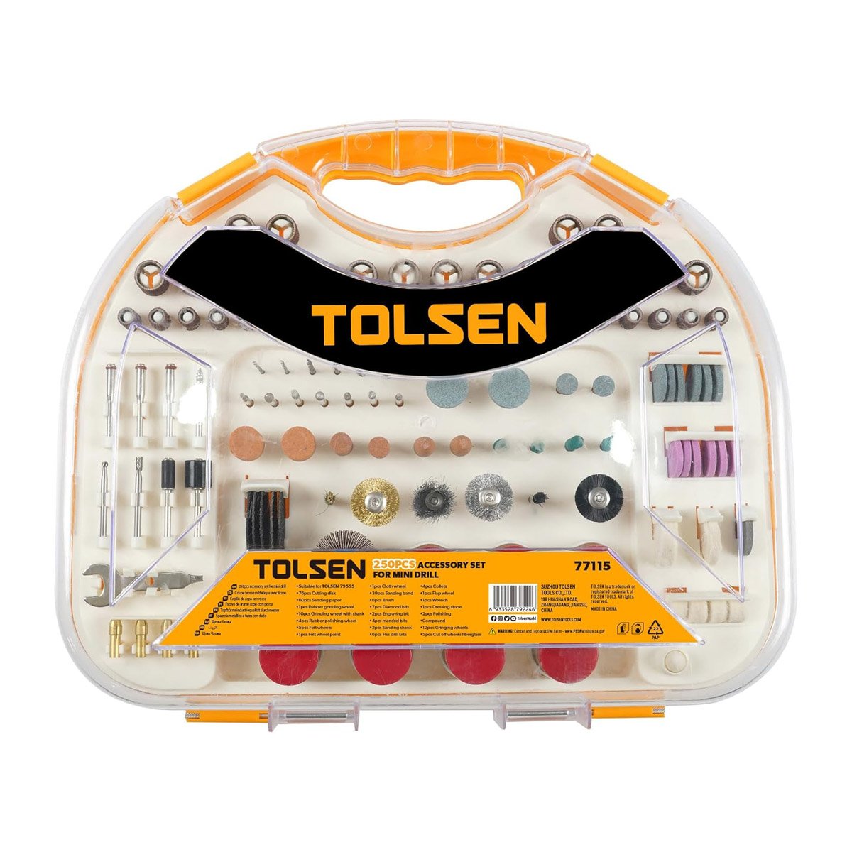 Tolsen – 250Pcs Accessory Set For Mini Drill,77115 “Suitable for TOLSEN 79555 76pcs Cutting disk 60pcs Sanding paper 1pcs Rubber grinding wheel 10pcs Grinding wheel with shank 4pcs Rubber polishing wheel 5pcs Felt wheels 1pcs Felt wheel point 1pcs Cloth wheel 39pcs Sanding band 6pcs Brush 7pcs Diamond bits 2pcs Engraving bit 4pcs mandrel bits 2pcs Sanding shank 6pcs Hss drill bits 4pcs Collets 1pcs Flap wheel 1pcs Wrench 1pcs Dressing stone 2pcs Polishing Compound 12pcs Gringing wheels 5pcs Cut off wheels fiberglass Packing: plastic box with color label”