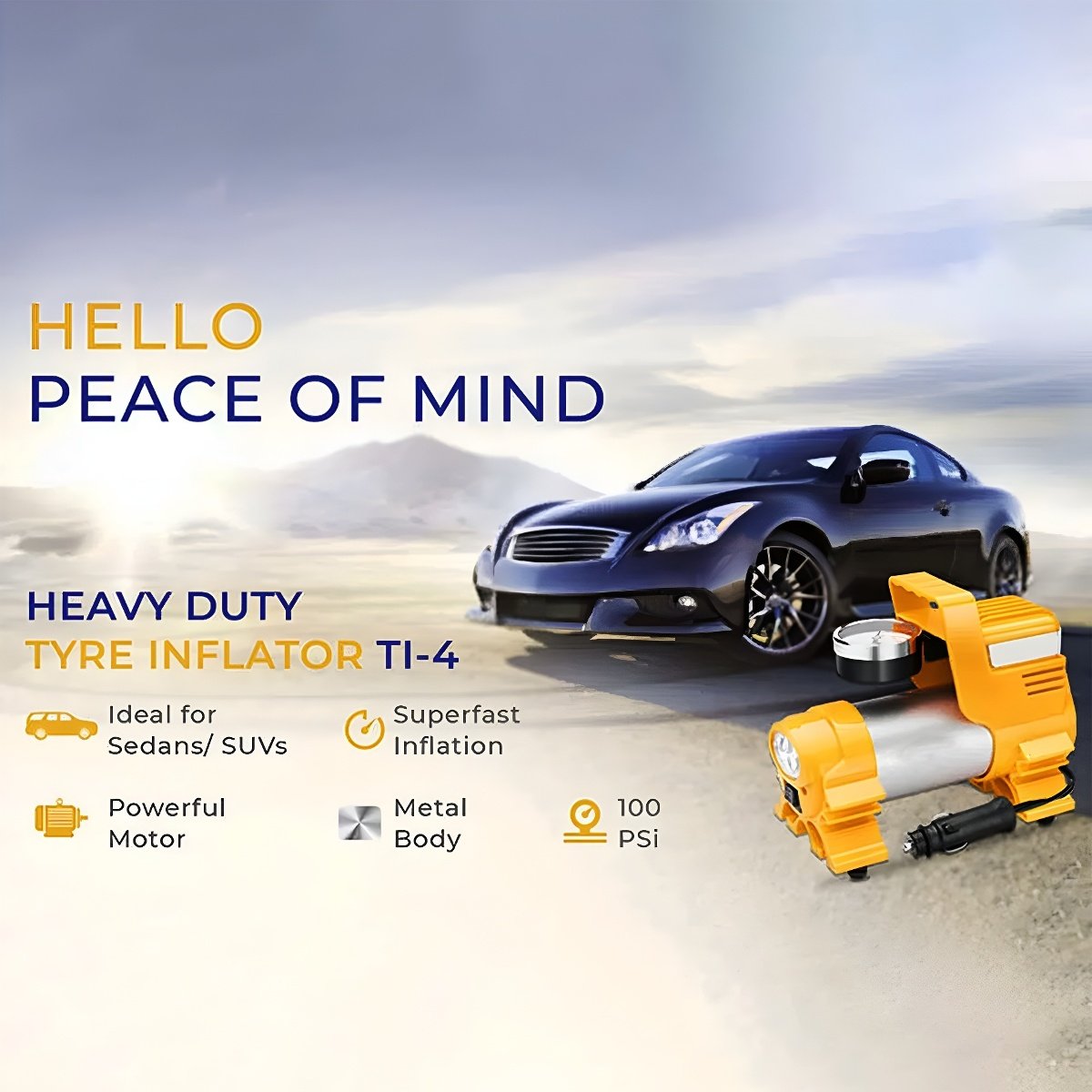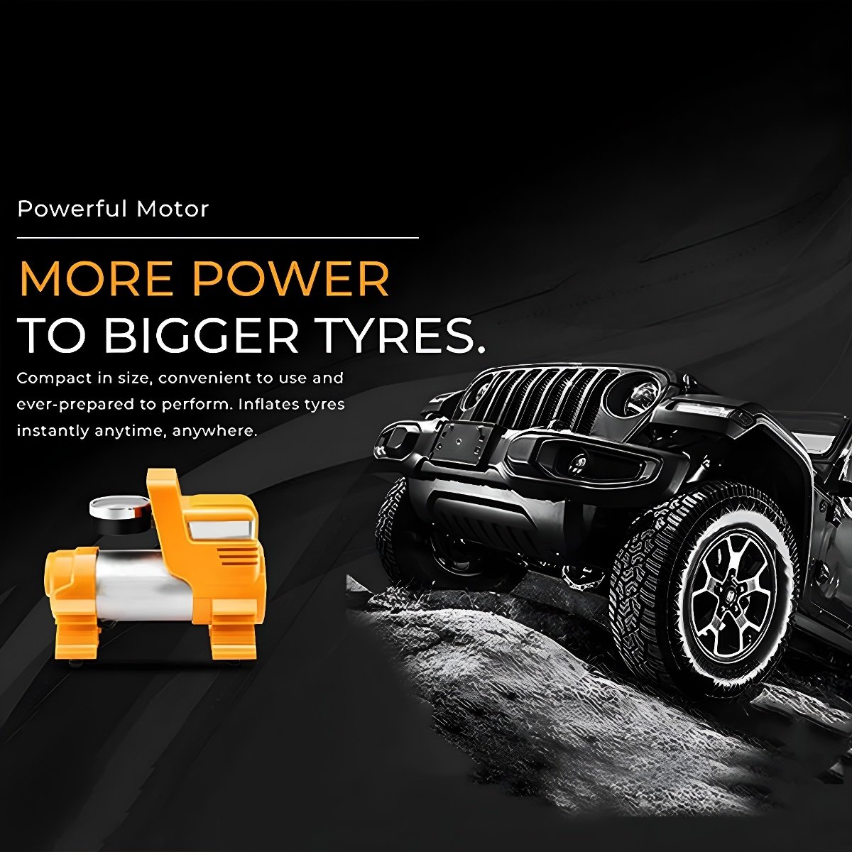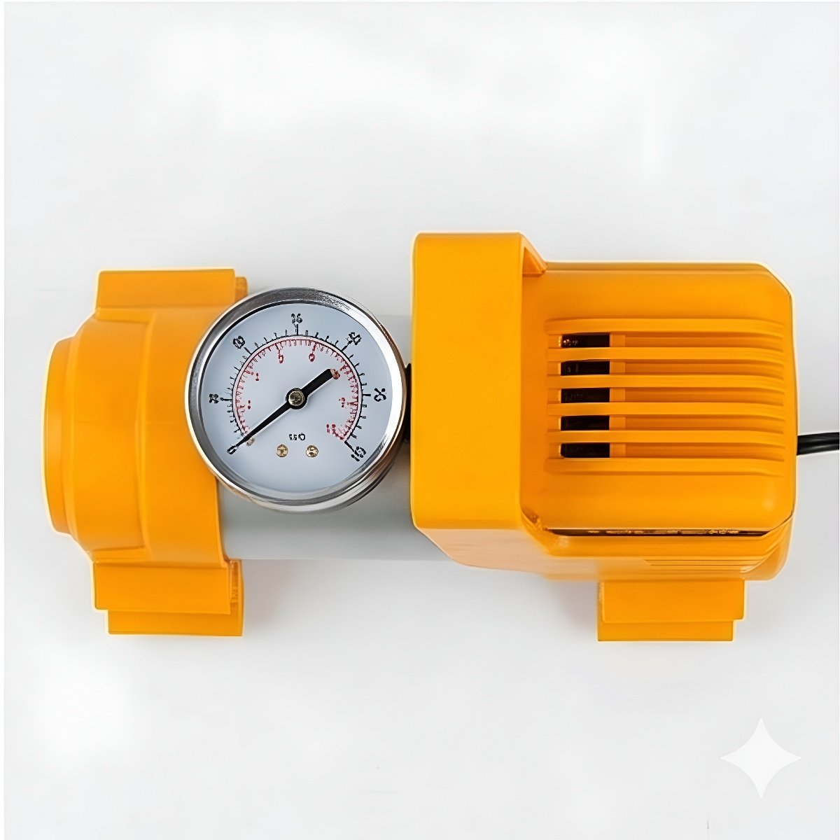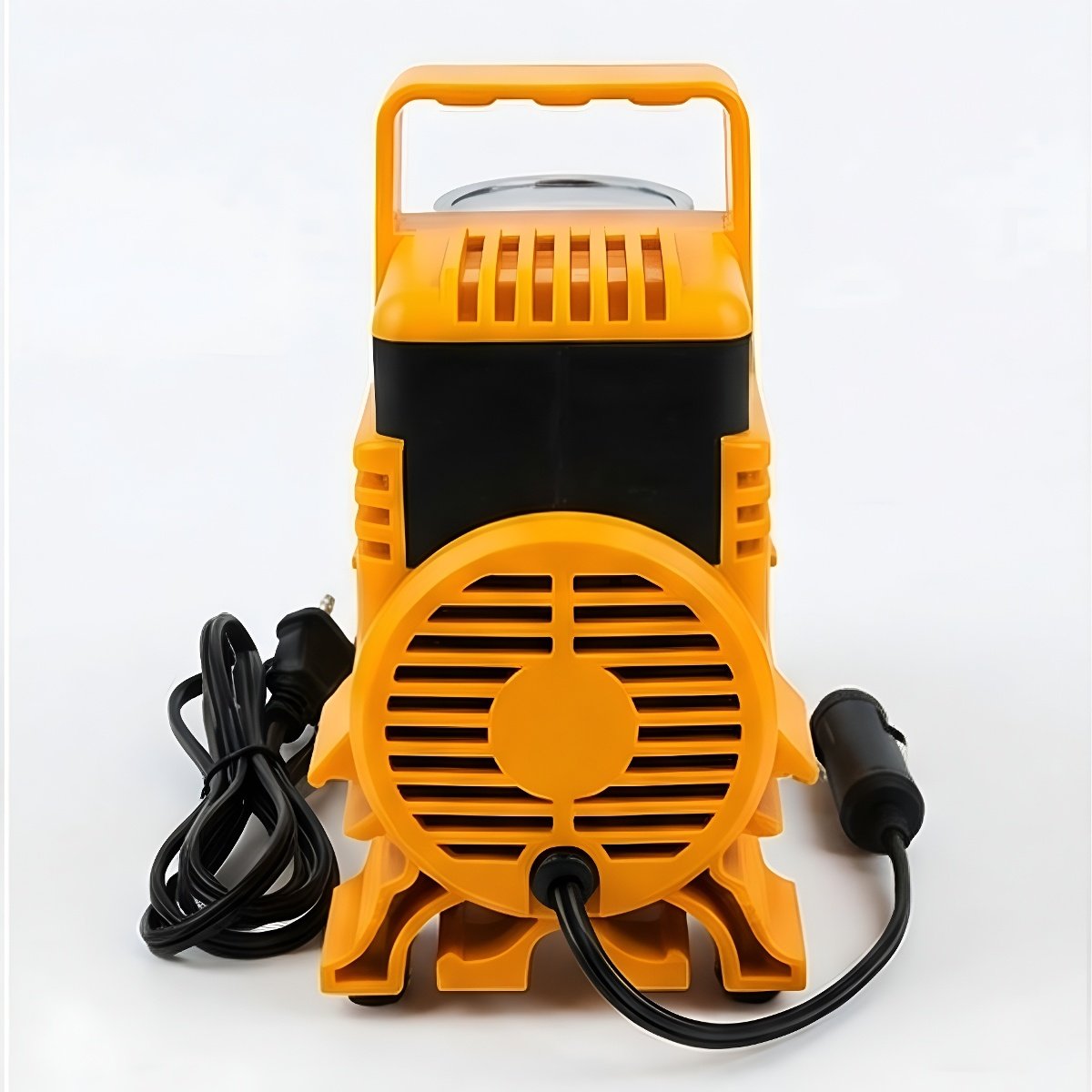 PORTABLE DESIGN: Compact 12V DC car tyre inflator with durable yellow housing, perfect for emergency roadside use and routine maintenance