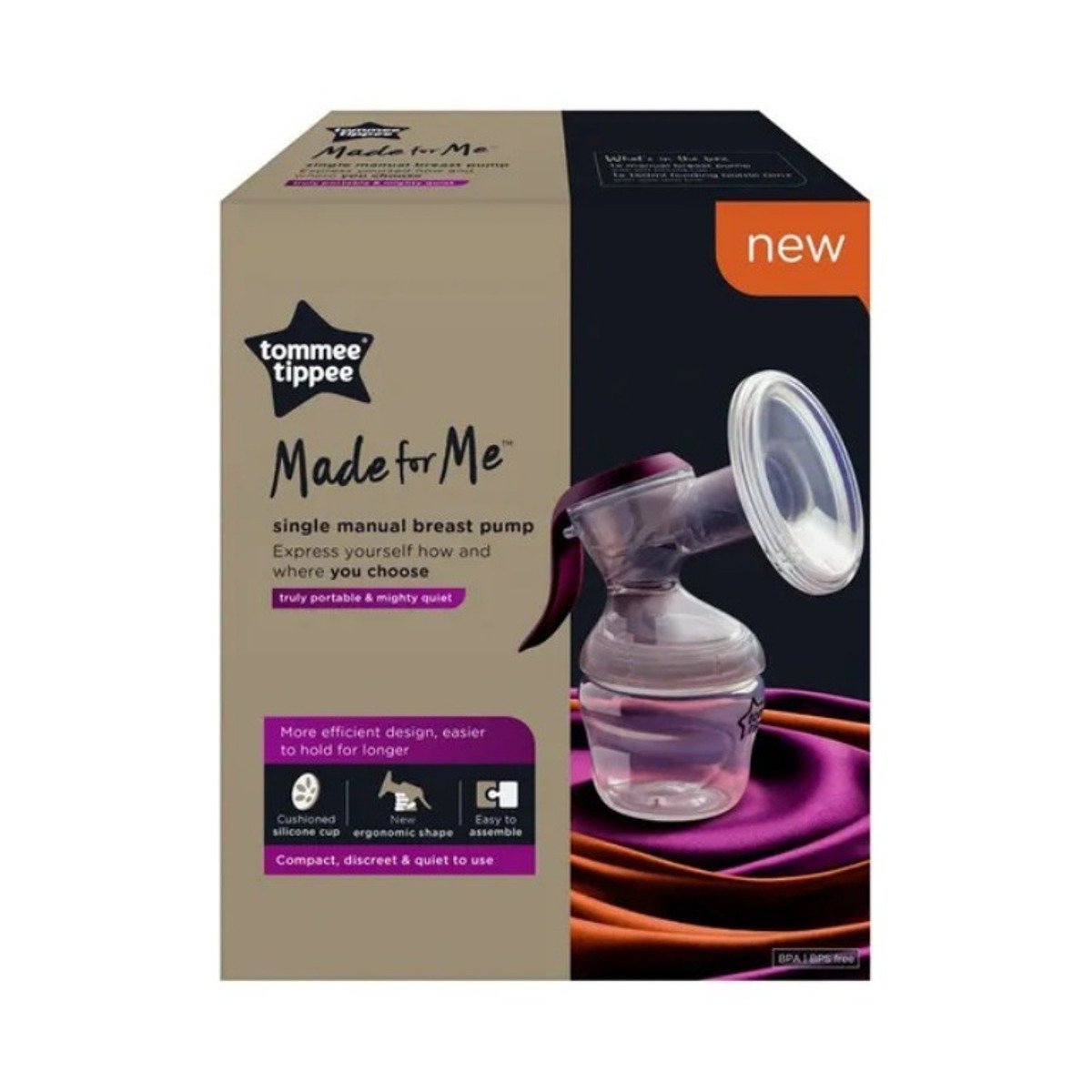 This Tommee Tippee made for me single electric breast pump is significantly quieter than the leading electric breast pump available. Its slimline, portable, lightweight power pack helps mums express breast milk efficiently while being discreet enough to give them the confidence and freedom to use it anywhere. It has 5 massage and 9 express settings to help stimulate milk flow and pump efficiently, so mums can choose the option that’s most comfortable for them at different stages of their breastfeeding experience. You’re thinking baby, we’re thinking mum: Your breasts are amazing! From about 16-22 weeks, they start producing colostrum – early, concentrated milk, packed with nutrients and disease-beating antibodies. Once your baby arrives, you and your wonderful breasts provide everything they need for the best start in life. But that doesn’t mean it’s easy. Breastfeeding can be challenging and uncomfortable for many mums, so the least we can do is try to make things a little easier and smoother, wherever possible. Our Made for Me collection includes a range of easy-to-use breast pumps, a soothing nipple cream and super absorbent breast pads – designed to keep you comfortable and confident enough to rise to the awesome challenge of being a mum! , , Some mums find manual pumps hard to use, as the repetitive motion can make hands feel even more tired than they already are! We get that. That’s why we’ve developed a new ergonomic design, perfect for the size of women’s hands, that requires less power to pump. You still get an efficient and effective way to express your precious breast milk, but you can still feel both your hands by the end of it!Box Contains: 1 x Tommee Tippee Manual pump; 1 x 150ml Closer to Nature Bottle with 0m slow flow teat. Many mums choose manual pumps because they’re simple and soundless. This pump is both of those things but it’s also really comfy. The soft, cushioned, silicone cup is gentle on sore breasts, and the ergonomic handle means you can hold and pump easily with one hand, without discomfort.