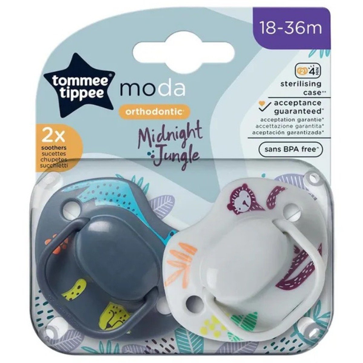 Tommee Tippee MODA Soother, (18-36 months), Pack of 2   The instinctive action of sucking helps to calm and soothe babies and all parents know there’s nothing more wonderful than a calm, content baby. So, when you need to turn screams and sobs into smiles and sleep, simply pick up a Tommee Tippee Anytime soother. Soothers are known by many different names such as dummies, pacifiers, dodies and binkies. At Tommee Tippee we use the word soother’ as it does just that, soothes baby. , , Your baby’s oral development is an important factor to consider when giving your baby a soother which is why our soothers have been designed with oral development in mind. The symmetrical baglet allows your baby’s tongue and jaw to rest in the correct position therefore supporting the healthy, natural development of your baby’s mouth, teeth and gums. Our Anytime soothers feature a symmetrical soft silicone baglet that is fully reversible and has no right side-up’ so the soother will always be placed correctly in your baby’s mouth, even when baby puts the soother in their mouth themselves. , , The curved shield sits comfortably between baby’s chin and nose and the holes in each side allow extra air flow and prevent the build-up of moisture which helps to protect baby’s delicate skin against irritation. The BPA-free silicone baglet is soft and flexible whilst also being robust and durable. The smooth surface of silicone is very easy to clean and won’t absorb stains and odours. Simply pop in a steriliser, wash by hand or in the dishwasher. , , We recommend that you replace the soother every month and always at the first signs of damage or weakness. Tommee Tippee Anytime soothers are simple and stylish with a range of beautiful designs for style as individual as your little one. We have removed all single-use plastic from our new 6 packs of Anytime Soothers and the cardboard packaging is 100% recyclable   Features Symmetrical orthodontic* design: The Tommee Tippee Moda soother features a symmetrical silicone teat and with no wrong’ side up, it will always be placed correctly in baby’s mouth Acceptance guaranteed: Accepted by 98% of babies**, the 100% medical-grade, BPA-free silicone teat is soft, flexible but extremely durable and won’t absorb stains and odours Kind on baby’s skin: The curved shield ensures a comfortable fit between baby’s nose and chin and the large holes allow extra air flow and prevent moisture build-up to help prevent skin irritation Mum recommended: Loved by mums and babies, our Moda dummies help to settle baby, with 99% of mums reporting they would recommend our soothers to others** Modern designs: Simple and stylish with a range of beautiful designs for style as individual as your little one
