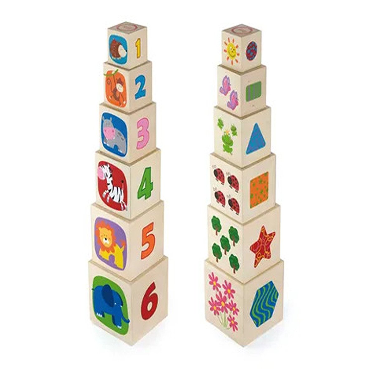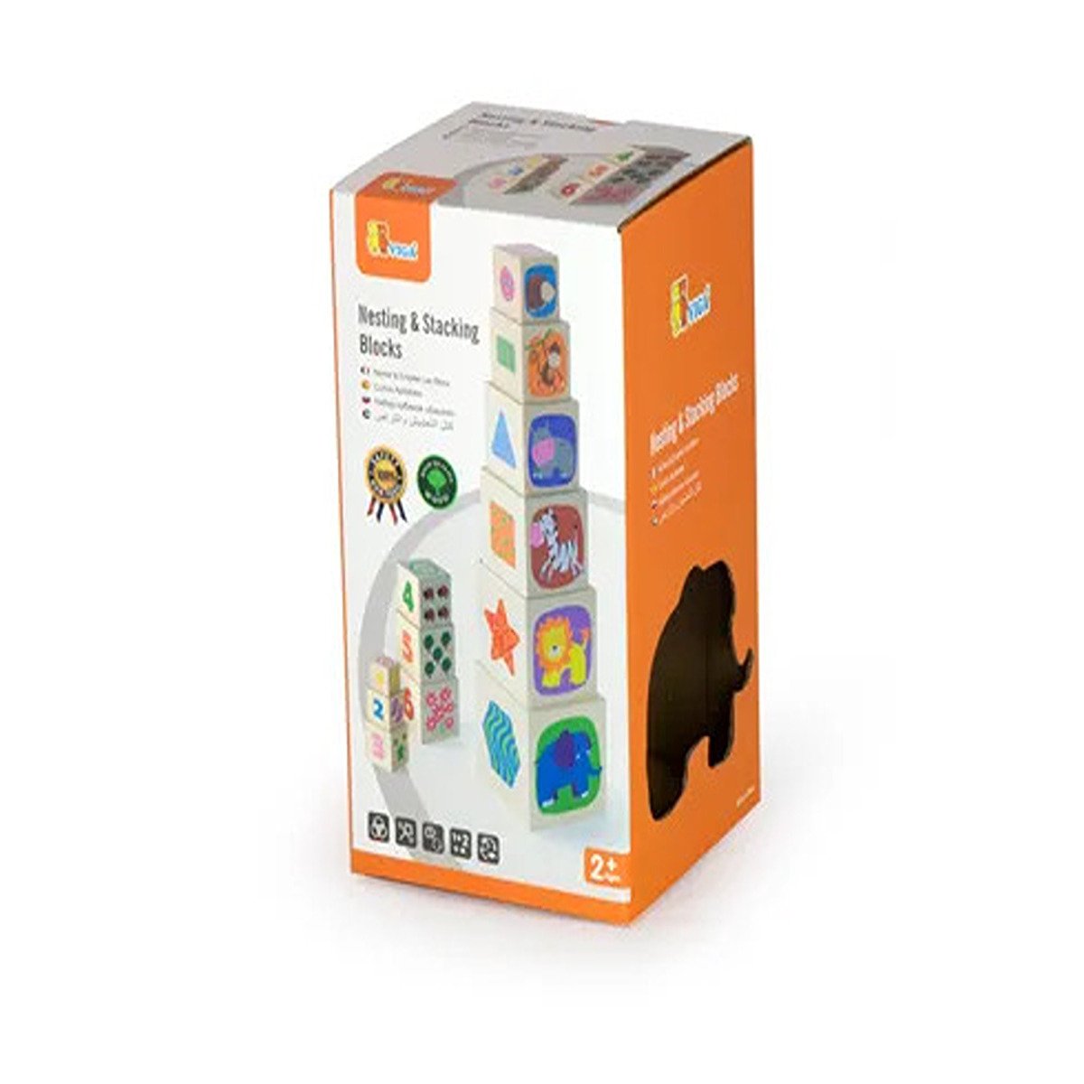 Natural, safe, educational and fun are the characteristics of VIGA toys. All products have a beautiful design and high quality. A block set of six different sizes, five sides of each block are silk screened with adorable images. Young children are introduced to numbers, colors, shapes, sizes and animals whilst playing with nesting and stacking.