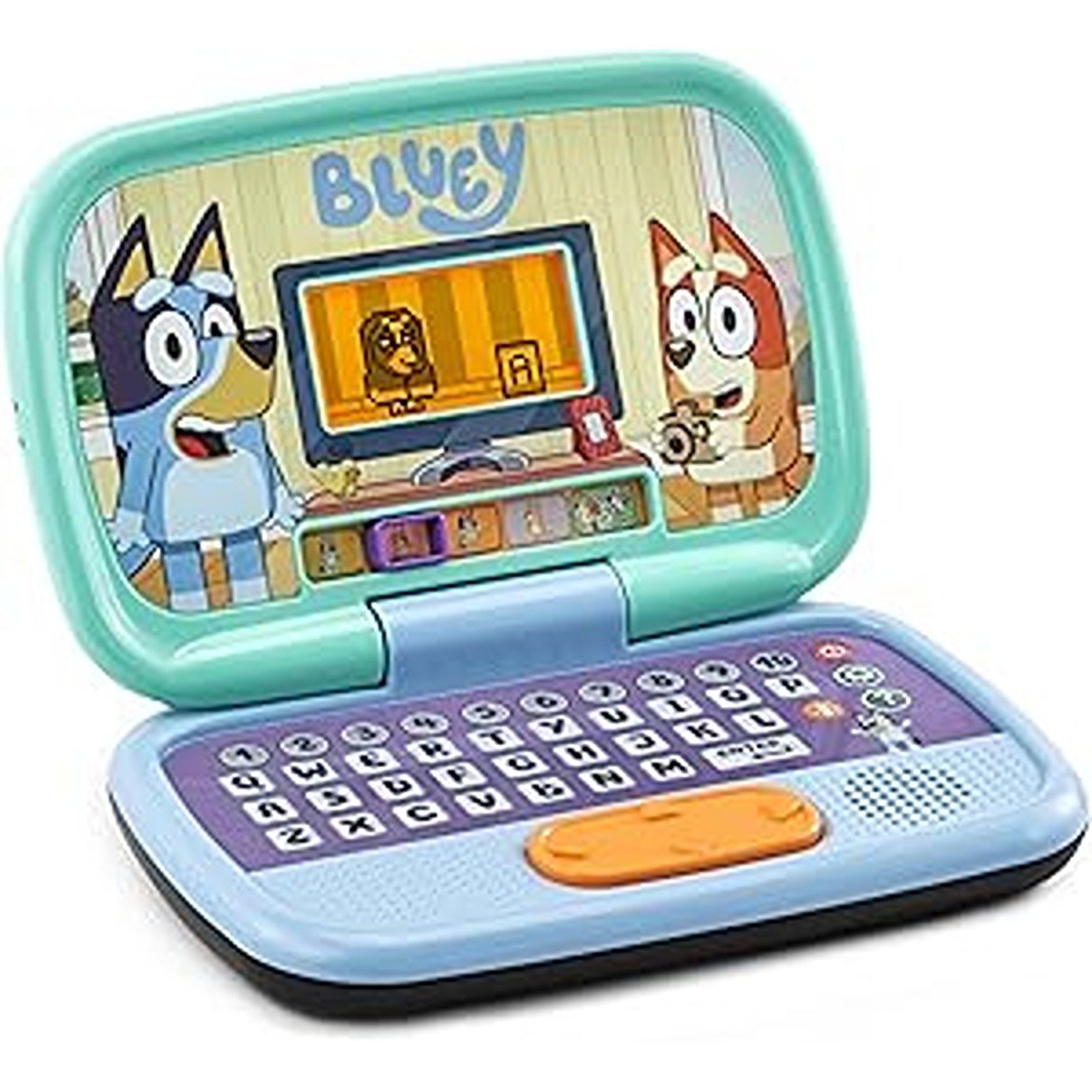 Explore 10 interactive games with the Bluey Game Time Laptop. Bluey-themed laptop encourages role-play and is packed with 5 modes and 10 activities exploring letters, numbers, problem-solving skills and more! Help Bluey to block the rain by filling the dam wall, watch Bluey dance and add fun sounds to the music or press the Bluey Button to hear her talk. Includes the real voices of Bluey and Bingo. Features back-lit LCD screen, QWERTY keyboard including 1-10 number buttons and click-tick track pad.
