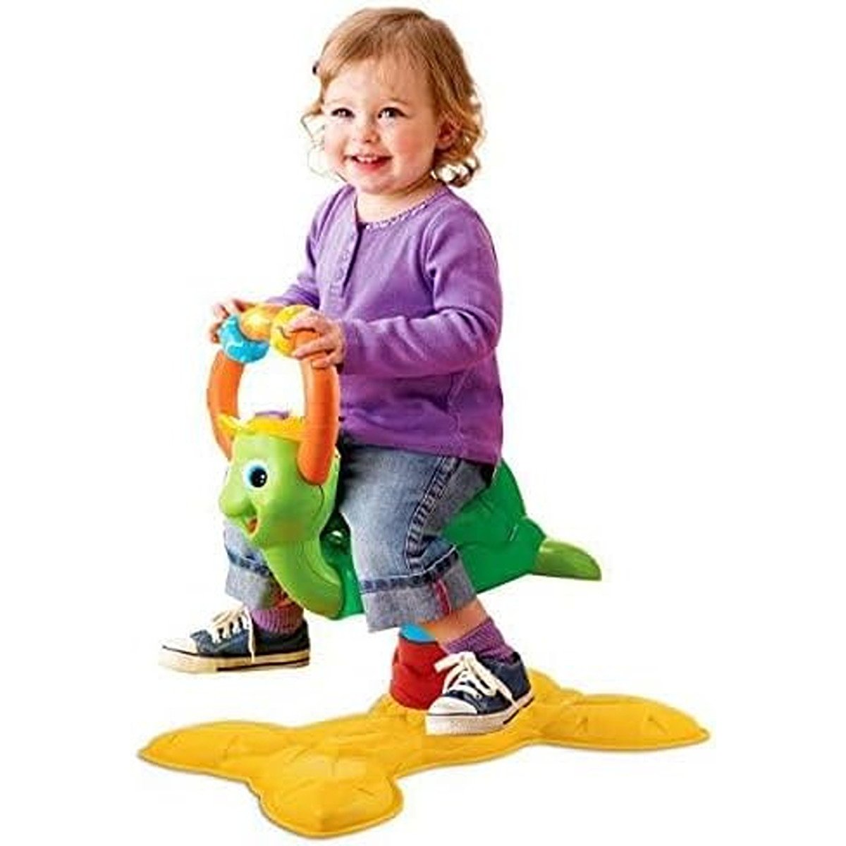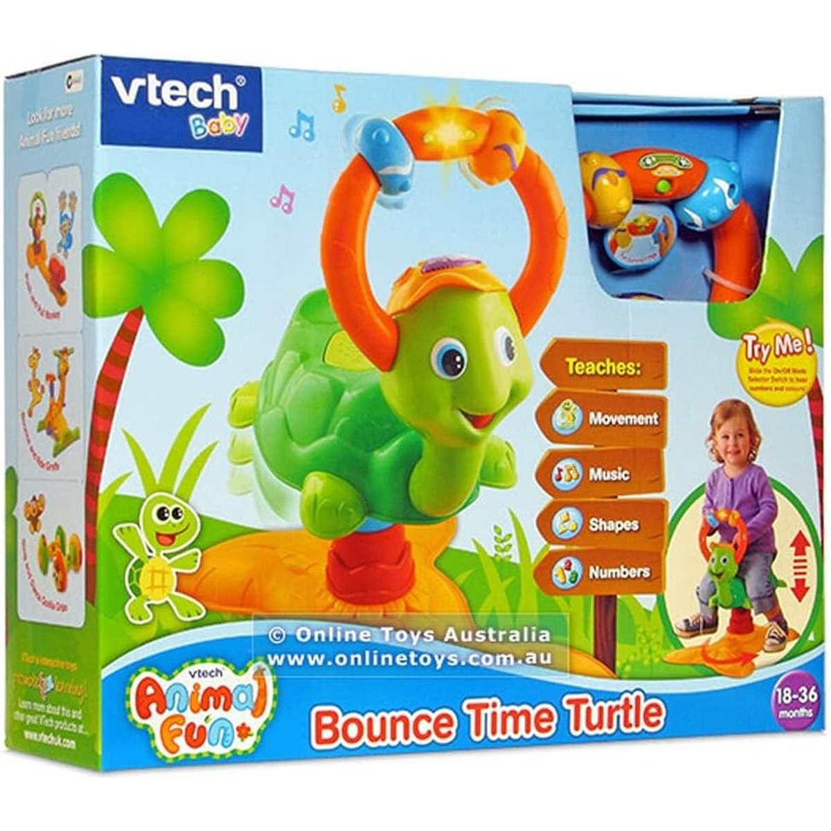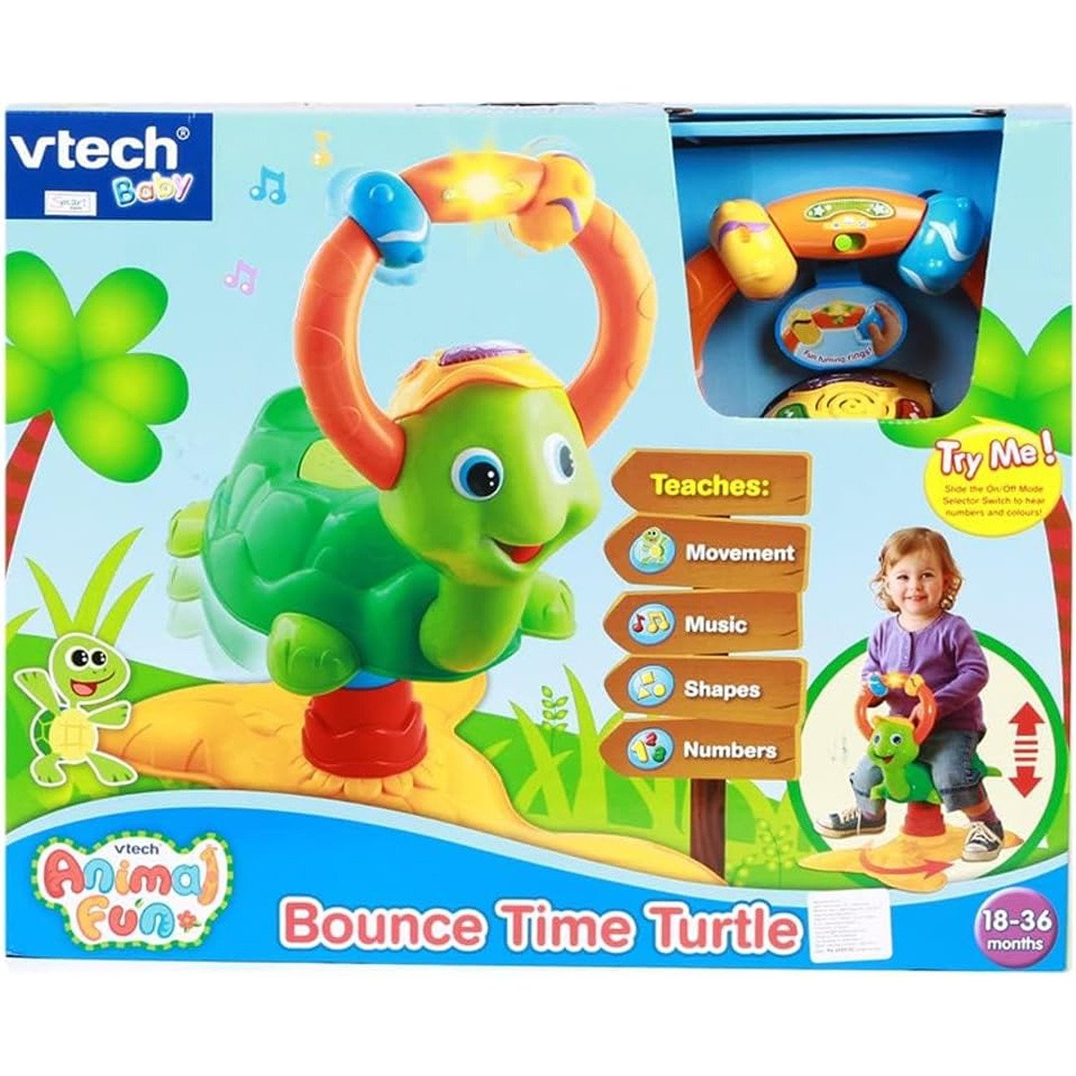 The Bounce Time Turtle will keep your toddler guessing as they are asked to find colours, numbers and shapes by bouncing! Fun phrases and questions encourage your toddler to keep bouncing and finding fun new words and melodies. With fun sing-along songs, 2 modes of play, 3 light-up push buttons and 2 turning rings this bouncing character will keep your toddler learning and moving? Bouncer design develops gross motor skills.
