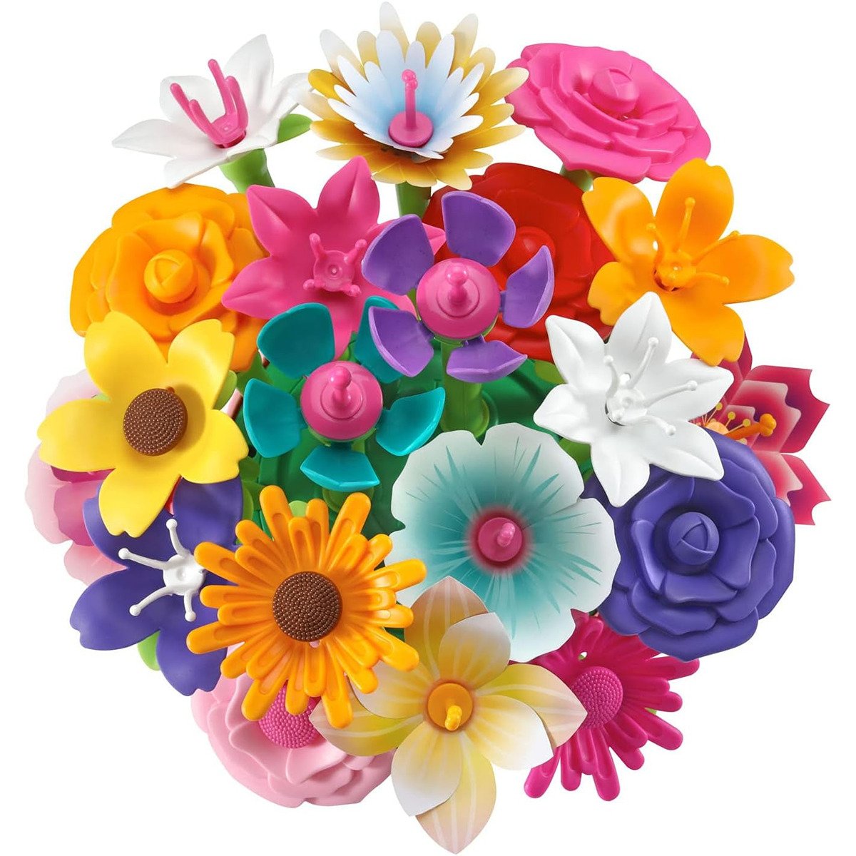 Creativity is in bloom with the Make & Spin Bouquet! With over 100 pieces made from 90% reclaimed plastic, budding florists will be able to create tons of different combinations. Build different flowers with a variety of stems, flowers, stamen and foliage, then choose where to place them in the pot. Fly the bee and butterfly over the creation and perch them on the petals to rest! Use the included flower templates to colour in more petals and add your own unique twist. Once the bouquet is completed add some music, then watch as the flowerful creation spins and blooms in time to the rhythm. With this set that can be created again and again, spring is always in season!