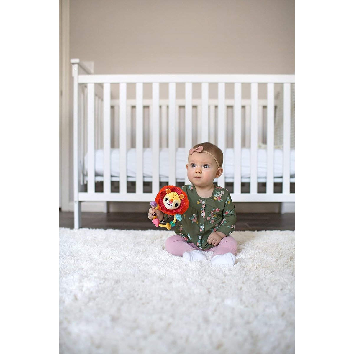 Pick up the easy-grasp, open-ring handle and feel the multi-textured beads, then give it a shake to hear the beads clack as they slide back and forth. Reaching for, holding and waving this colourful rattle help your baby practice fine and gross motor skills. Listen for the sound of the hidden bell! Bright colours and patterns are a visual treat for your baby’s eyes. Touch, hear and see all this lion rattle has to offer!