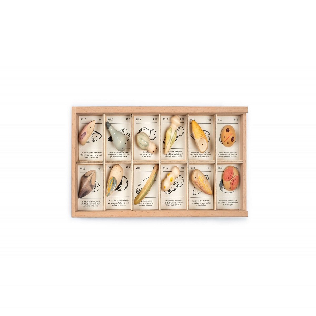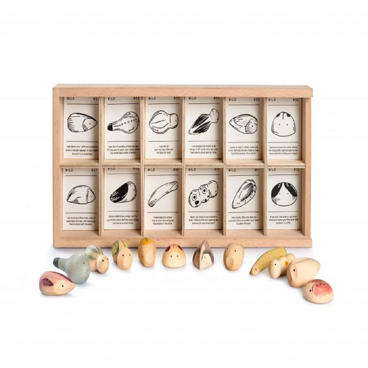 Wild is a collection of 12 creatures from the fauna realm. On the edge between fantasy and reality, each has their own superpower and story written on their card as an invitation to play. The sorting tray is included for storage and collecting, but can become a perfect complement to any open-ended play activity.